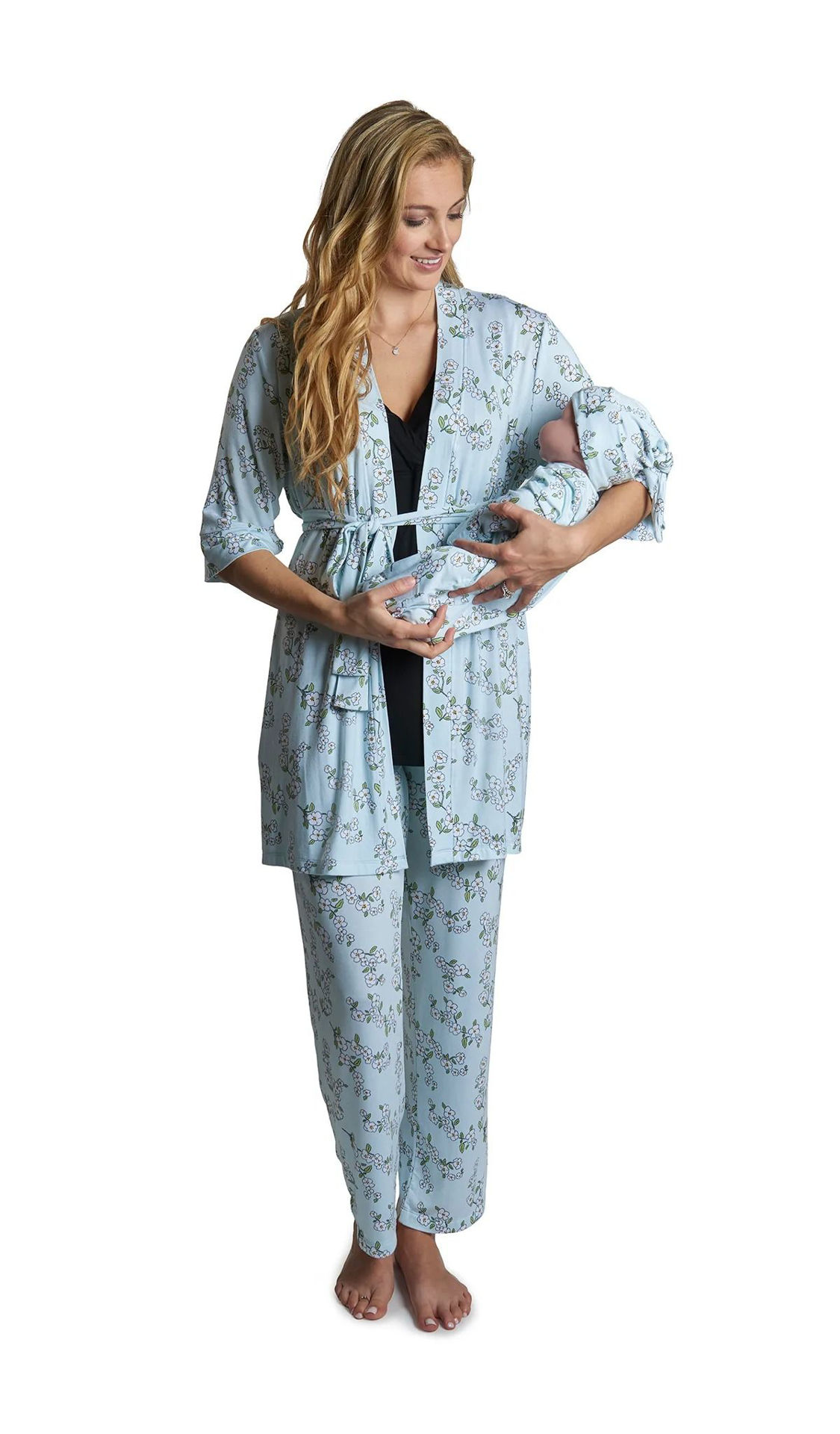 Like mommy, like baby! This soft and stylish 5-piece gift is the perfect sleep and loungewear set for pregnancy, hospital and home. Mom's maternity/nursing top has cross-over chest that pulls aside for easy nursing, while the pant has a stretchy, smocked waistband that fits just under the belly. She can throw on the 3/4-sleeve short robe as a stylish cover up when family and friends visit to see the newborn in her matching gown and hat! So cute!
