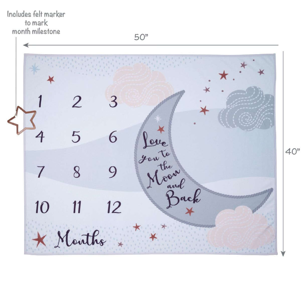 Celebrate each month of your baby’s 1st year with our Goodnight Moon milestone photo opportunity baby blanket. Made in a super soft white polar fleece featuring a large grey crescent moon with the words “Love you to the Moon and Back.” Place the star shaped felt marker on the month of your baby’s age for a camera-ready moment. Generously sized at 50 inches by 40 inches, providing ample space for playtime, tummy time, and, of course, that perfect social media/keepsake photo.