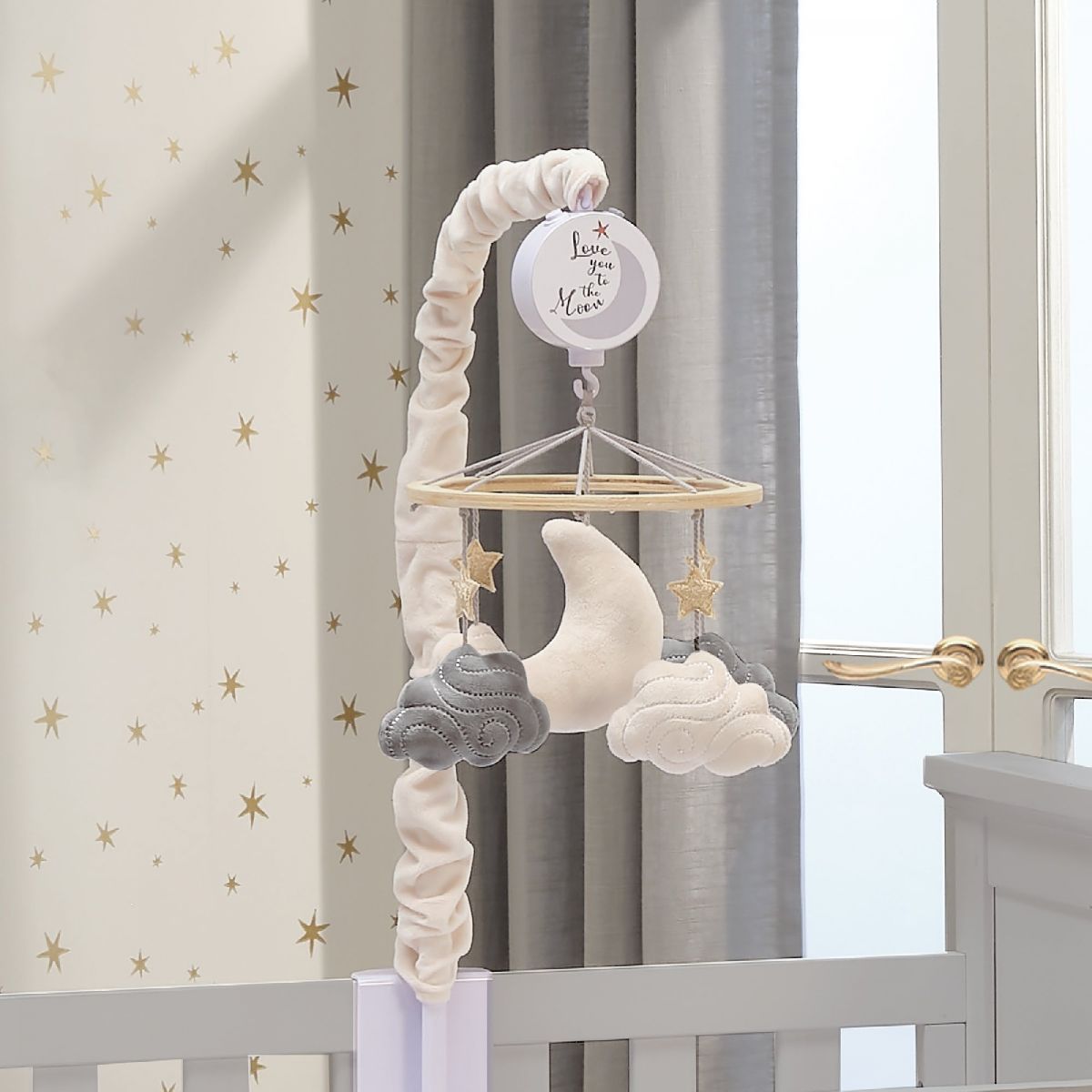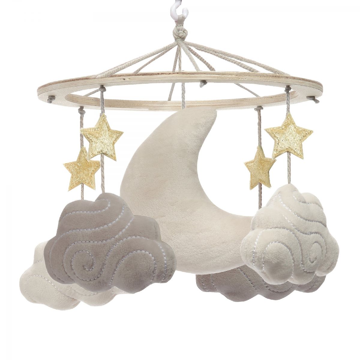• Four velour embroidered clouds, a crescent moon and gold stars decorate this celestial mobile