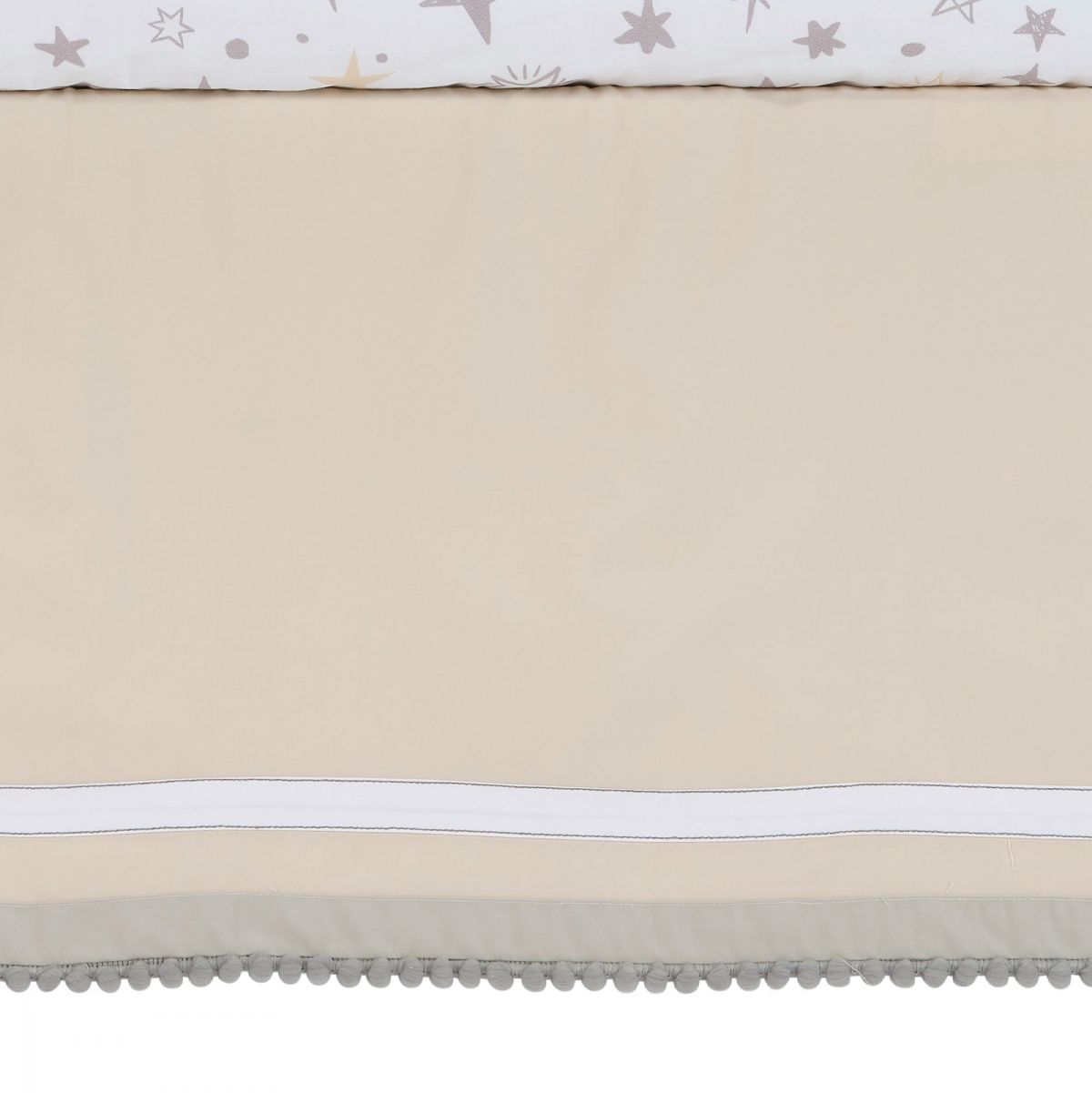 Your little one will reach for the stars with this dreamy gender-neutral three-piece nursery crib bedding set. The set includes one quilt, one breathable 100% cotton fitted crib sheet and one crib skirt. This amazing cotton sateen quilt front is expertly embroidered and appliqued. There are heather gray chambray clouds, creamy velour appliqued cloud, appliqued copper stars, and a large embroidered crescent moon with a 3-dimensional star and the words, “You are my sun my moon and all of my stars” embroidered in script writing. The back of the quilt is a 100% creamy cotton twill. The fitted crib sheet is 100% cotton and is a tossed print of crescent moons and stars on a soft white ground. The fitted crib sheet has elastic all the way around ensuring a safe and secure fit on a standard size crib mattress. The crib skirt adds the finishing touch to your child’s crib. It is made in a cotton twill in a lovely creamy color. There is a ¾” wide white twill tape along with gray pom poms.