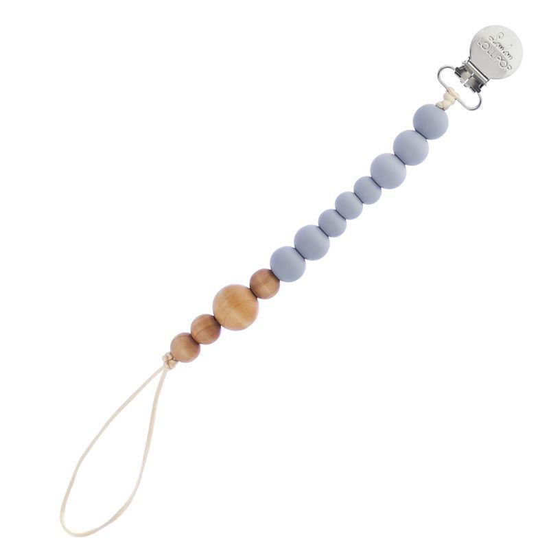 Warm blue silicone beads on pacifier clip with addition of solid wood beads (100% natural finished with bees wax and olive oil) Attaches to most pacifiers.