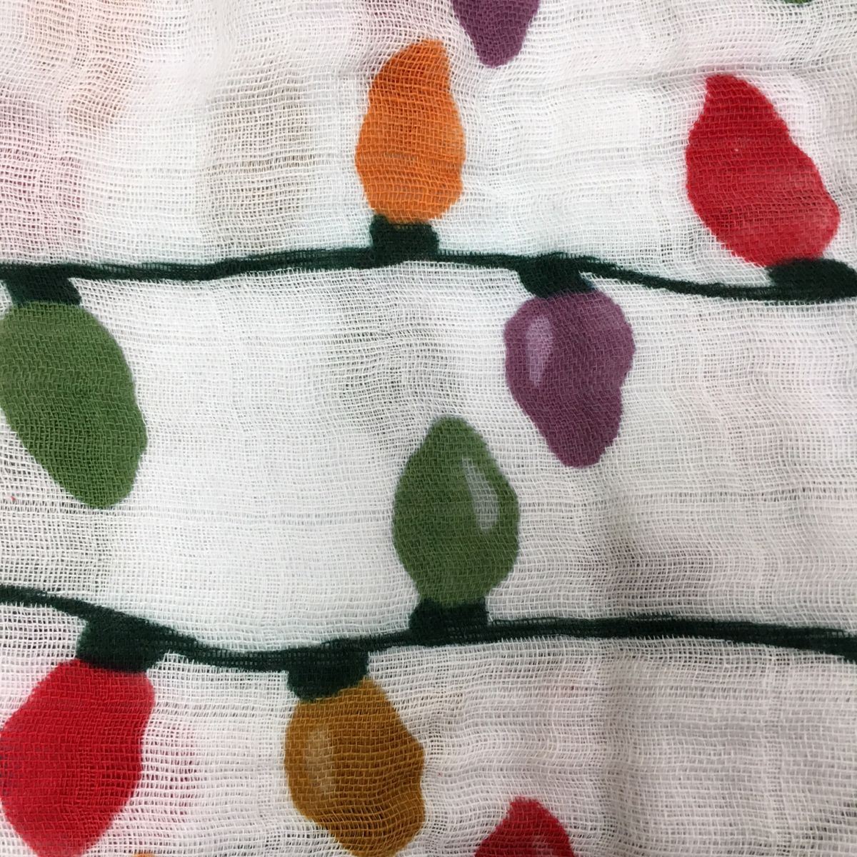 Three pack of lovely and large 47"x 47" cotton muslin swaddle blankets. Features Holiday Haul (cars with trees), Bulbs, & Red Plaid designs.
