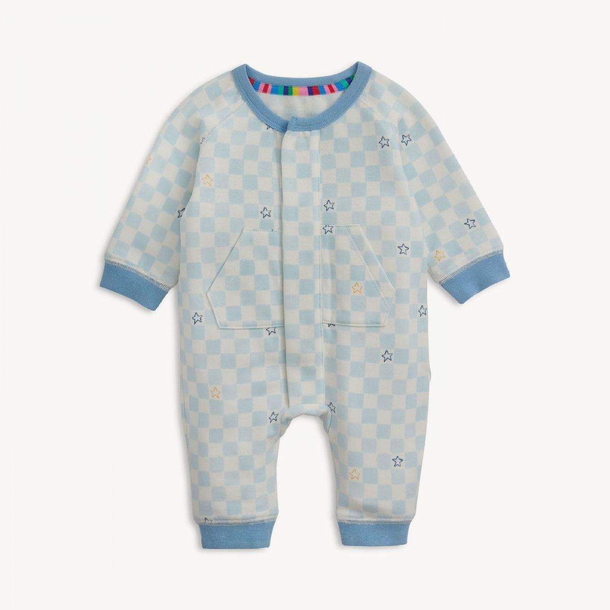 Soft blue and cream checkerboard design. Our Sweatshirt Romper is designed with magnetic closures down the front, so you can dress baby in no time flat. Made of a super soft knit with a fuzzy, brushed interior, It's an all-in-one style for snoozing under a blanket in the stroller or snuggling on the couch.