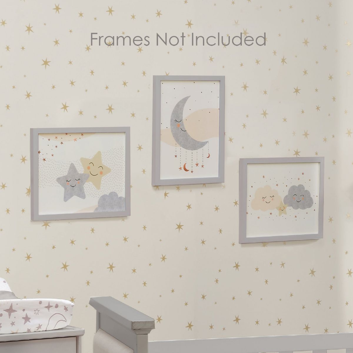 • One print features smiling clouds, one a gray crescent moon with smaller copper metallic stars and moons, and one with two smiling stars, a cloud, and a trail of metallic stars